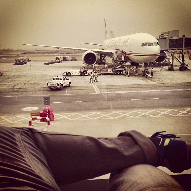 Ну собственно аэропорт маленький.если Летите этихардами и стыковка более 4 часов,то на стойке этихардов вам дадут ваучер на еду. Сиденья-лежанки понравились.А так народу много а система глупая:(